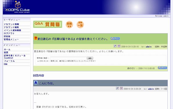 | コメント | 質疑応答フォーラム、FAQといったQ&Aコンテンツを作るのに特化したモジュールです。同じような目的を持つモジュールに「教えて!Xoo」がありますが、CQAは作者であるkilicaさんのセンスと相まって全体的にほがらかな雰囲気を醸し出しています。たとえば、画像にもある「質問箱」「質問する」といった画像のデザインが柔らかくていいですよね。 XOOPSは本体もそうですが、モジュールもデザインがタイトなことが多いです。堅い印象という言い方でもいいかもしれません。近寄りがたい雰囲気というのはやはりあると思います。その状態で「初心者向けの場所」を作ってもいろいろと厳しい部分がありますよね。 初心者だけではなく、困っている人に対しては内容だけではなく見た目というのも大事です。読む気になってくれるデザイン、雰囲気というのでしょうか。カスタマイズすることなく始めからそういうものを出せるこのモジュールは、初心者、困っている人向けのコンテンツを作るための大きな手助けとなるでしょう。 |
