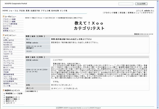 | コメント | タイトルの元になったと思われる「教えてgoo」同様、まず質問者が質問を投稿し、それにみんなが回答を寄せるというシステムのモジュールです。FAQというより、Q&A型フォーラムといった方がいいでしょう。 フォーラムで質問したいんだけど、かなり敷居が高いというユーザは結構多いのではないでしょうか。また、「あ、その質問の答え、俺知ってるな」という人がいたとしても、「管理人さんに質問しているんだろうから、俺が出しゃばるのはよくないな」と流してしまう人も多そうです。このモジュールは完全に質問フォーラムとして特化しているので、質問を書く方も回答を寄せる方も気が楽だと思います。 質問が多数寄せられるようなサイトに導入すると、管理する負担をきっと減らしてくれるでしょう。 なお、ダウンロード先にあるファイルはGIJOEさんによる改変版になります。 |